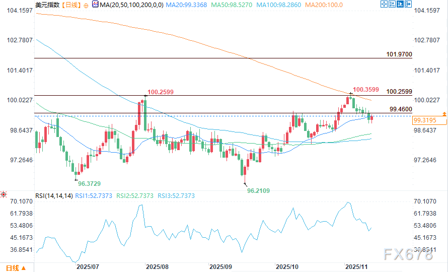 周五(11月14日)美盘时段,美元指数在守住周四98.991的盘中低点后,小幅回升至99.30附近企稳,但整体仍承压,本周累计跌幅有望达到0.3%。此前美国政府停摆结束,大量延迟的经济数据即将集中发布,交易员正为此做准备。