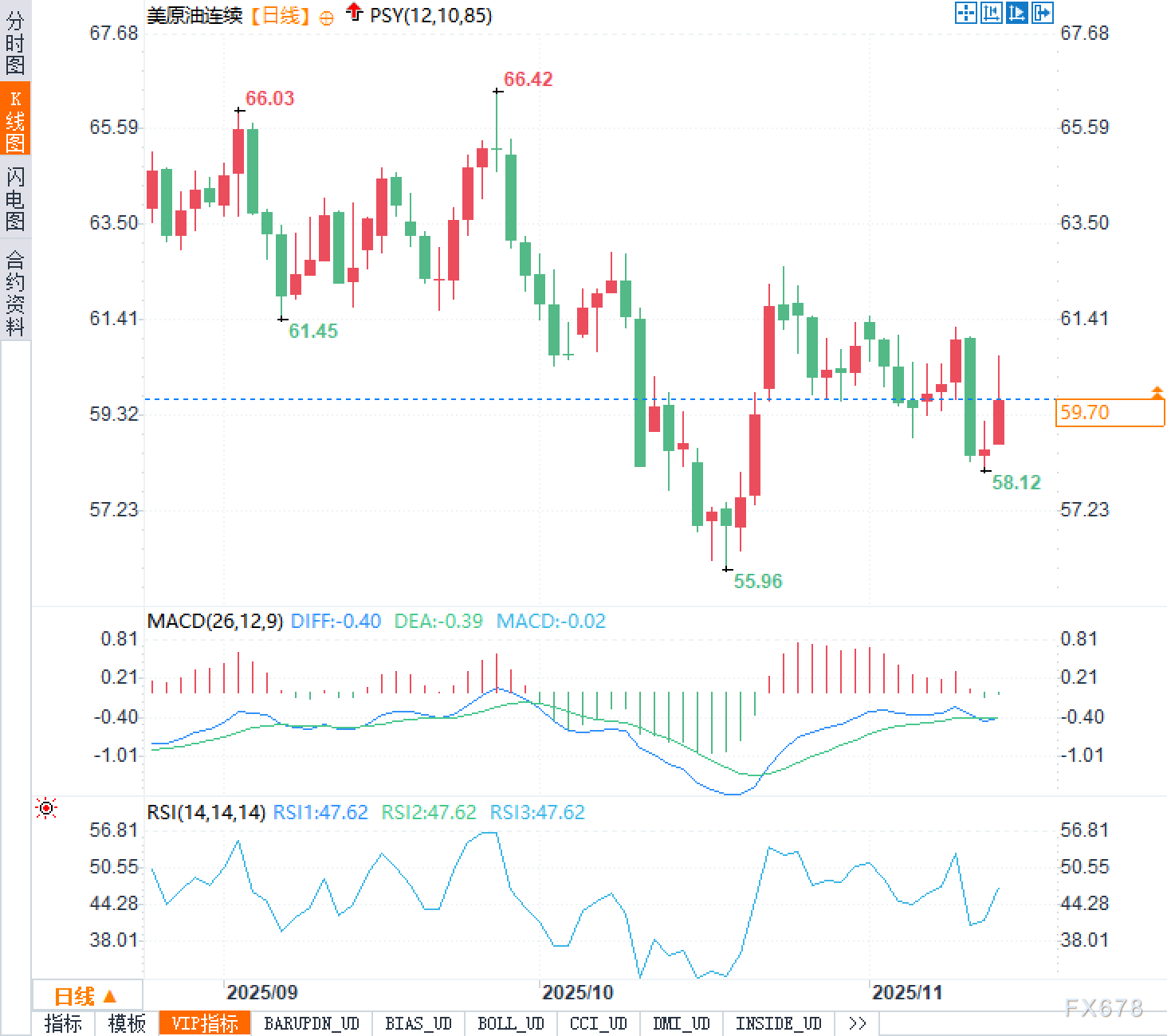 从支撑阻力的层次结构来审视,油价当前处于多个关键价位的夹层之中。55.96美元的近期低点构成了首要的下方支撑位,该位置多次触及而未能有效击穿,显示出较强的支撑效力。向上看,60.10美元的水平位是近期必须突破的第一道阻力。若能站稳该位置,则61.45美元将成为下一个测试目标。进一步向上,66.03美元和66.42美元构成的前期高点区域,则是多头需要克服的核心压力带,这一区域的密集成交和强烈的获利盘抛压,使其成为趋势反转的关键验证位。