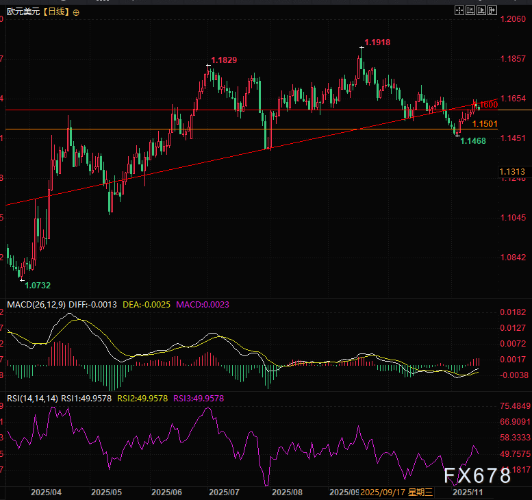 周一(11月17日)欧元兑美元展开第二日回调,本周开盘后延续下行态势,一度震荡测试1.1600下方支撑位,目前成功收复早晨跌幅,,主要受市场谨慎情绪、美联储宽松预期退潮及地缘摩擦升温等多重因素叠加影响。当前市场目光高度集中于延迟发布的美国宏观经济数据,同时欧洲央行的政策表态与欧元区经济基本面分化,也为欧元走势增添了不确定性。