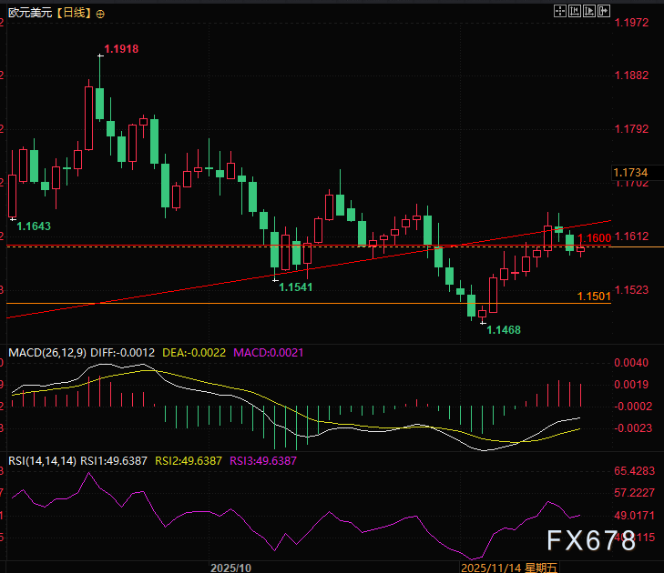 欧元兑美元延续下行态势,在1.1600关口遇阻后跌破周一低点1.1585,截至发稿时回升报1.1596,逼近周度低点。
