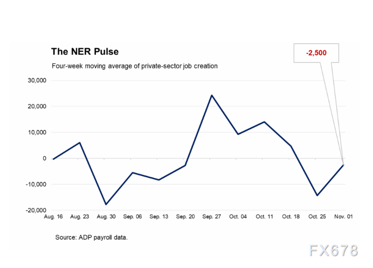 同时美国ADP周度就业报告显示截至2025年11月1日的四周里,私人部门平均每周减少2500个就业岗位,上周报告显示,截至10月25日四周内美国私营部门平均单周裁员1.125万人,劳动力需求疲软显现,美元指数随数据公布走跌0.2%,欧元随之收到提振收红。