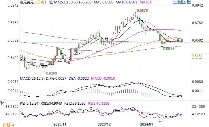 周二(1月30日),澳元/美元隔夜收低0.1%,报0.6601。澳洲12月零售销售大幅下滑2.7%,部分原因是消费者在11月大买特买之后有所克制。年销售额下滑到通常只有在经济衰退或新冠封锁期间才会出现的低点,这凸显出高利率和过往的通胀压力令家庭预算压力山大。这也促使市场认为,澳洲央行下周政策会议加息的可能性几乎为零。 期货市场暗示,澳洲央行6月首次降息的可能性约为56%,7月降息的可能性为94%。市场预计2024年全年将降息约43个基点,与美国和欧洲相比,相对温和。现在主要还是在等待美联储2月利率会议的揭晓,若会议上包括主席鲍威尔在内的官员们,如果对坚持高息出现进一步出现软化的表态,则澳元有望反弹回升。反之而言,若表态还需维持高利率一段时期,澳元则继续承压。