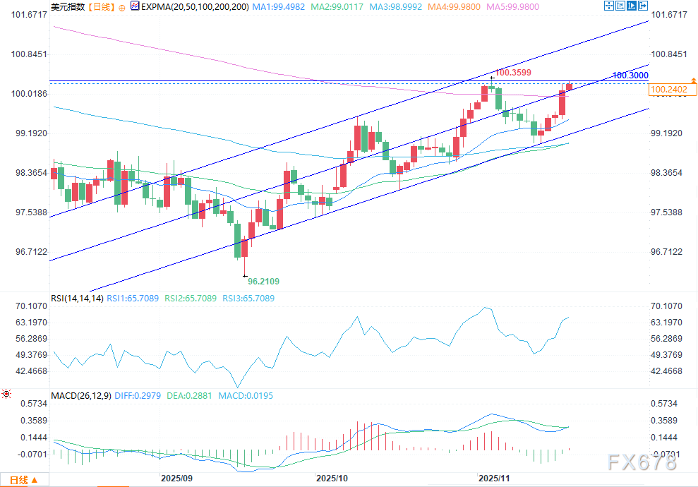 综合来看,美元指数在当前位置受技术指标、前期高点与通道结构的多重压制,若无法有效突破 100.3599,大概率将进入区间震荡或回调阶段,下方需关注上升通道下沿及短期均线的支撑有效性。