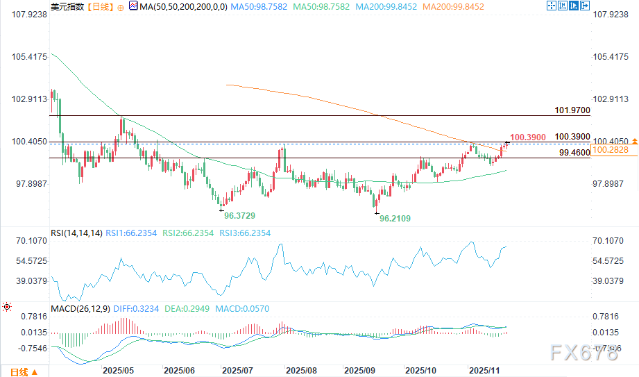 美元指数在早盘承压后反弹,目前正朝着当日高点100.39推进。尽管市场对12月“降息”的讨论愈发激烈,买盘仍持续支撑汇价走强。此次反弹反映出,在交易员重新评估政策预期并于波动周后调整仓位的背景下,美元需求依然稳固。