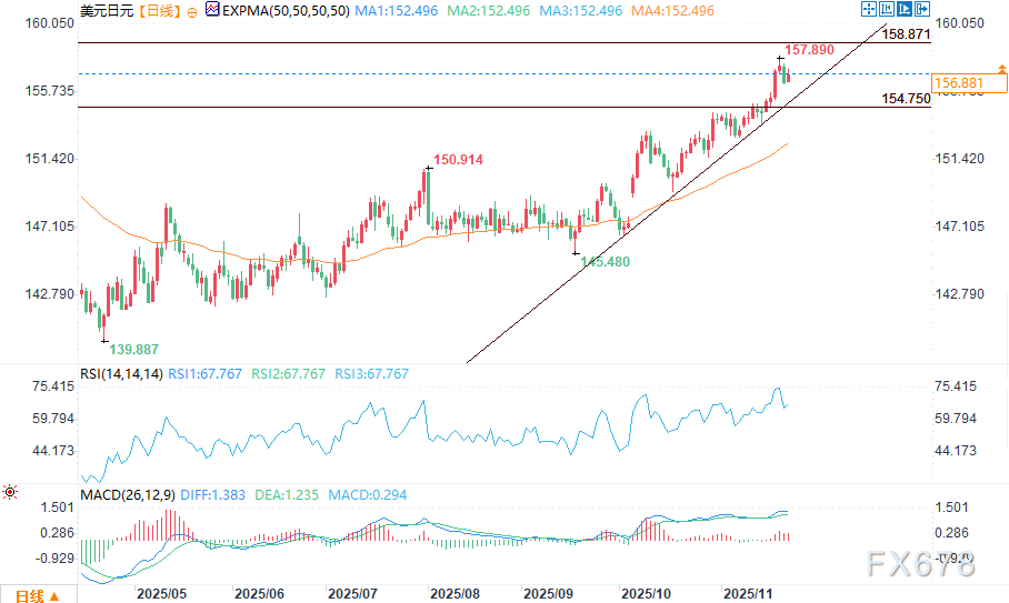 周一(11月24)日美盘时段,美元/日元维持短期上行趋势,价格从开盘 156.341 持续走高,日内最高点接近 157.185,当前回落至 156.785。