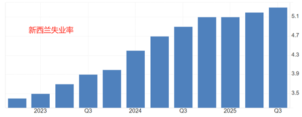 关于劳动力市场,声明中提到:虽然与过去的经济衰退相比,失业人数并不高,但职位空缺和工作转换一直很低,因此失业人员重新就业相对困难。历史数据看,2021年四季度以来,新西兰失业率持续升高,今年三季度达到阶段性高点5.3%,超出5%的充分就业标准线。美联储降息的理由是劳动力市场疲软,新西兰联储本次降息的原因与美联储相同。