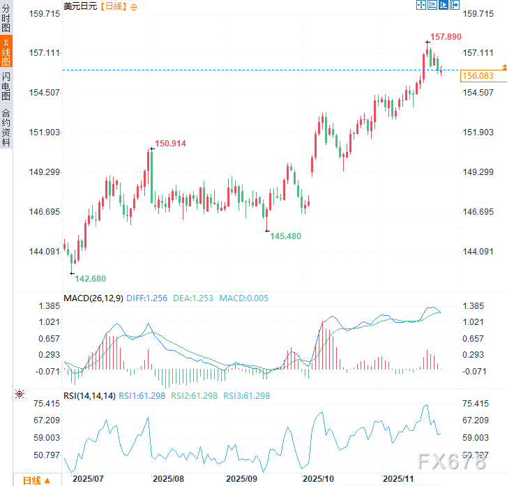 日本央行正为最早下个月的加息可能性向市场释放信号,消息人士称,随着对日元急剧贬值的担忧重燃以及要求维持低利率的政治压力消退,央行已重新采用先前的鹰派表述。周三(11月26日)亚洲时段,美元兑日元于156.08附近高位窄幅震荡,略低于上周创下的近十个月高点(157.89)。