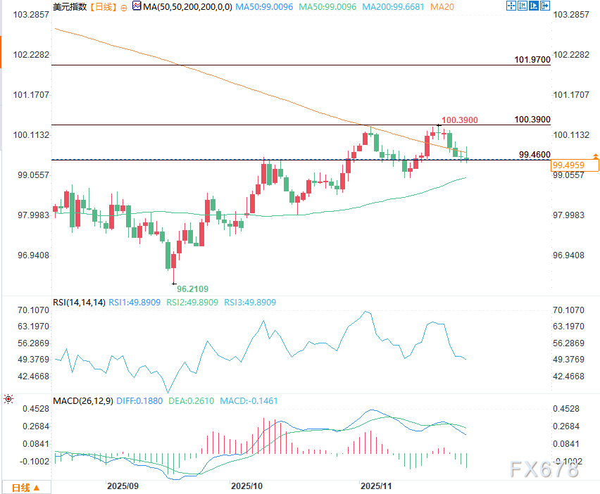 周五(11月28日)美盘交易时段,美元指数迎来小幅回升走势,但这一反弹力度有限,未能扭转其自七月下旬以来最陡峭的周度下跌态势。受此前感恩节假期影响,市场交投活跃度在假期后持续处于低位,即便全球交易员陆续重返市场,有限的资金流动仍使得价格波动幅度受到明显限制,整体市场呈现出谨慎整理的特征。