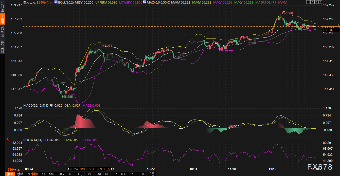 美元兑日元汇率 在4小时图上正处于关键均线密集区。当前报价156.321,紧贴布林带中轨156.252,而50周期均线(156.471)构成近期阻力。RSI指标位于49.441的中性区域,表明市场方向未明。需要关注的是,155-156区间曾被市场广泛视为日本当局可能进行外汇干预的心理防线。若汇率有效突破布林带上轨156.638,可能激发新一轮上行测试;反之,若跌破下轨155.865,将增加干预担忧,从而限制下行空间。