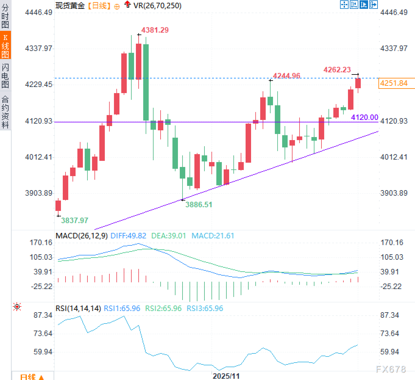 根据现货黄金的日线图分析,黄金价格近期处于震荡上涨的走势中。价格目前位于4250美元附近,接近前期高点4262.23美元的压力区域。价格在上涨过程中表现出一定的上涨动能,但仍面临关键阻力位的考验。