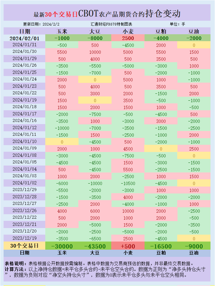 根据汇通财经观察,海外交易商估算的结果显示,本周四(2月1日),大宗商品基金增加CBOT大豆、豆粕、玉米、豆油投机性净空头头寸,增加CBOT小麦投机性净多头头寸。最新30个交易日,大宗商品基金增加CBOT豆油、豆粕、大豆、玉米投机性净空头头寸,增加小麦净多头头寸。