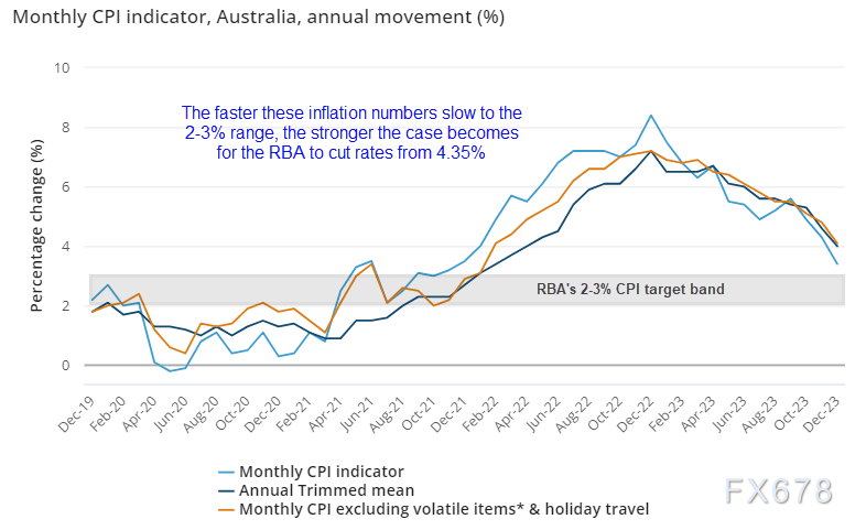 澳大利亚月度CPI报告可能会影响4月份发布的第一季度CPI报告的预期,进而改变3月份降息的押注。CPI数字越快接近2-3%的CPI目标,数据越可能会对澳元构成压力,使澳元兑美元更接近0.6000。