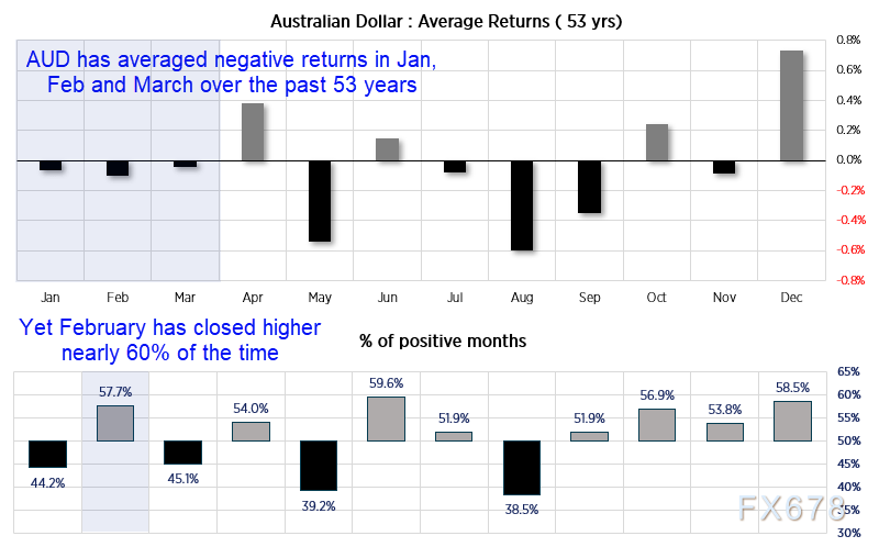 澳元/美元走势一直具有明显的季节性。在1月份回落之前,澳元在12月份强劲上涨(圣诞老人的反弹)。在过去的53年里,澳元/美元在1月、2月和3月的平均回报率为负,在1月和3月有58%的时间收低。然而,虽然2月份平均回报率为负,但实际上有近58%的时间收高,这表明看跌的月份超过了积极的月份。