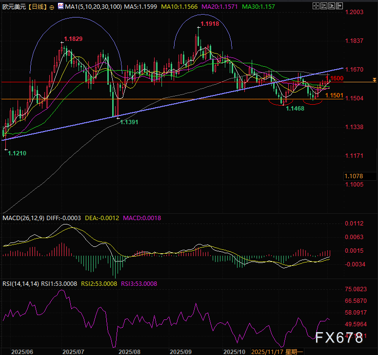 周二(12月2日)亚欧时段,欧元兑美元近期围绕高位展开震荡整理,此前周一在1.1650关键阻力区域遇阻回落,但仍坚守1.1600整数关口支撑目前交投于1.1607附近,凸显当前多空博弈下的区间震荡格局。