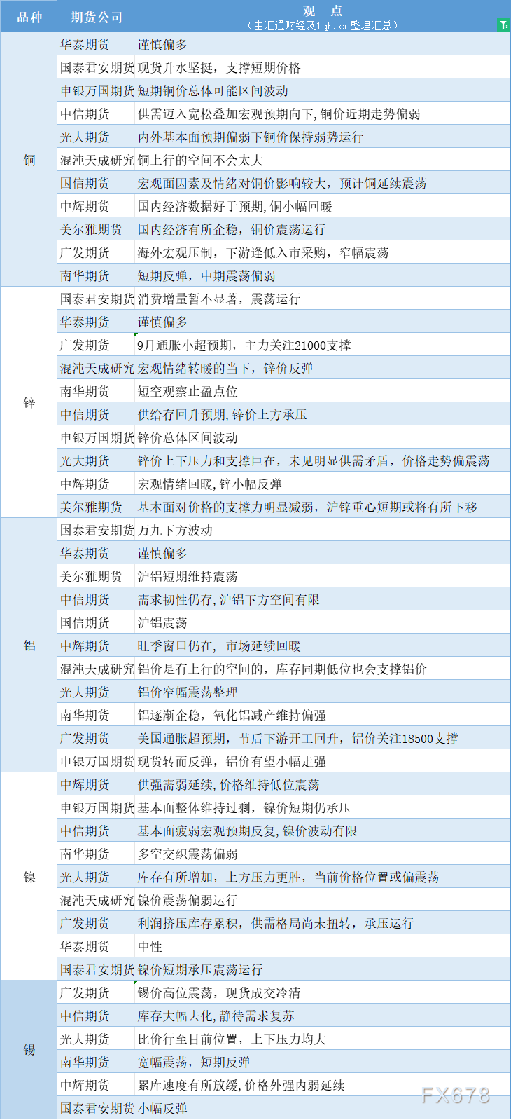 期货公司观点汇总一张图:10月19日有色系(铜、锌、铝、镍、锡等)