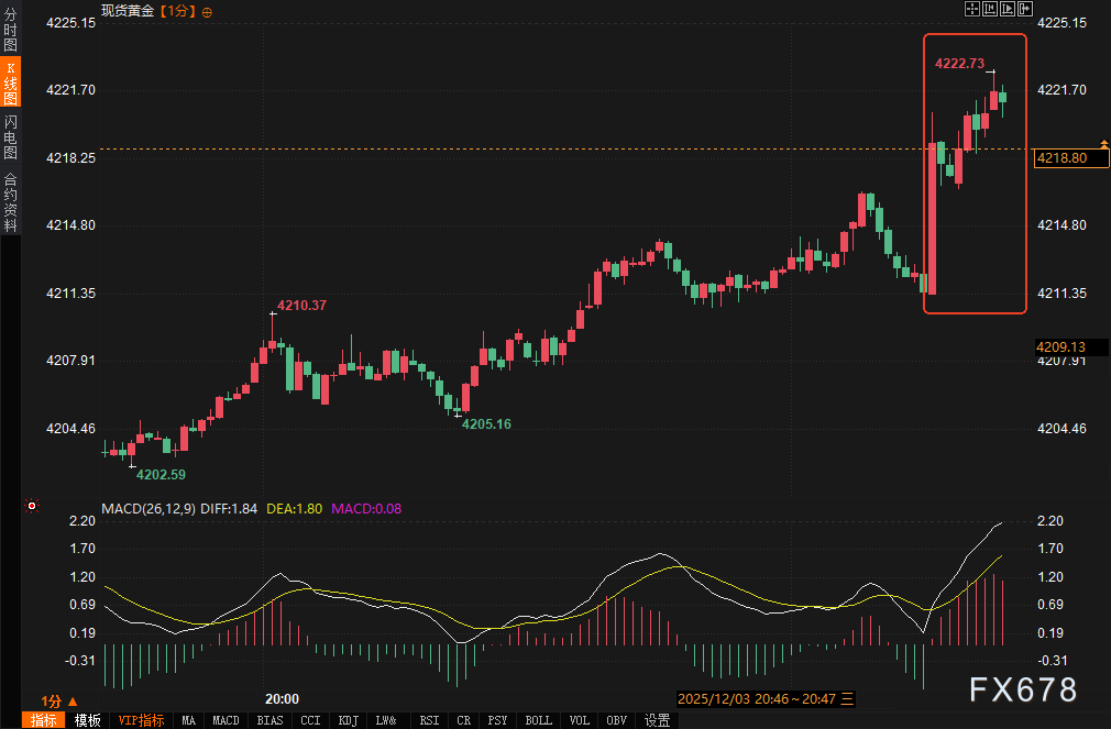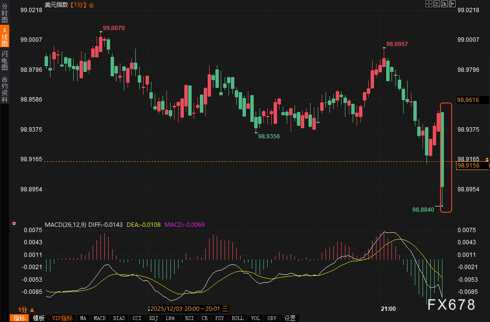 周三(12月3日)北京时间21:15,美国ADP就业报告公布,私营部门11月新增就业岗位减少3.2万个,远低于市场预期的微增1万。这是自2020年6月以来最差单月表现,显示劳动力市场下行压力加大。数据公布后,市场对美联储降息的预期显著上升,美元指数短线下挫约8个点,最低触及98.8840;现货黄金短线拉升近10美元/盎司,最高报4221.25美元/盎司。美股期货波动有限,但避险情绪主导盘中走势,投资者关注这一数据对宏观政策路径的影响。