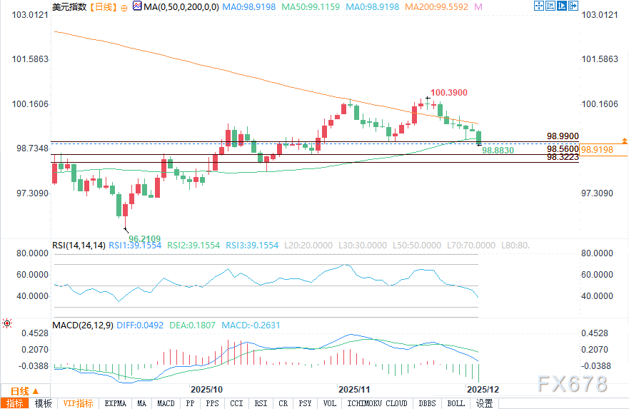 周三(12月3日)欧盘时段,美元指数遭遇显著抛压,空头趋势清晰可见。指数跌破50日均线关键支撑位99.117后,该水平已转化为新的阻力位;随后进一步失守98.991的震荡低点,进一步强化了下行动能。在国债收益率持续走低、市场坚定押注下周美联储将再度降息的背景下,美元缺乏实质性基本面支撑。
