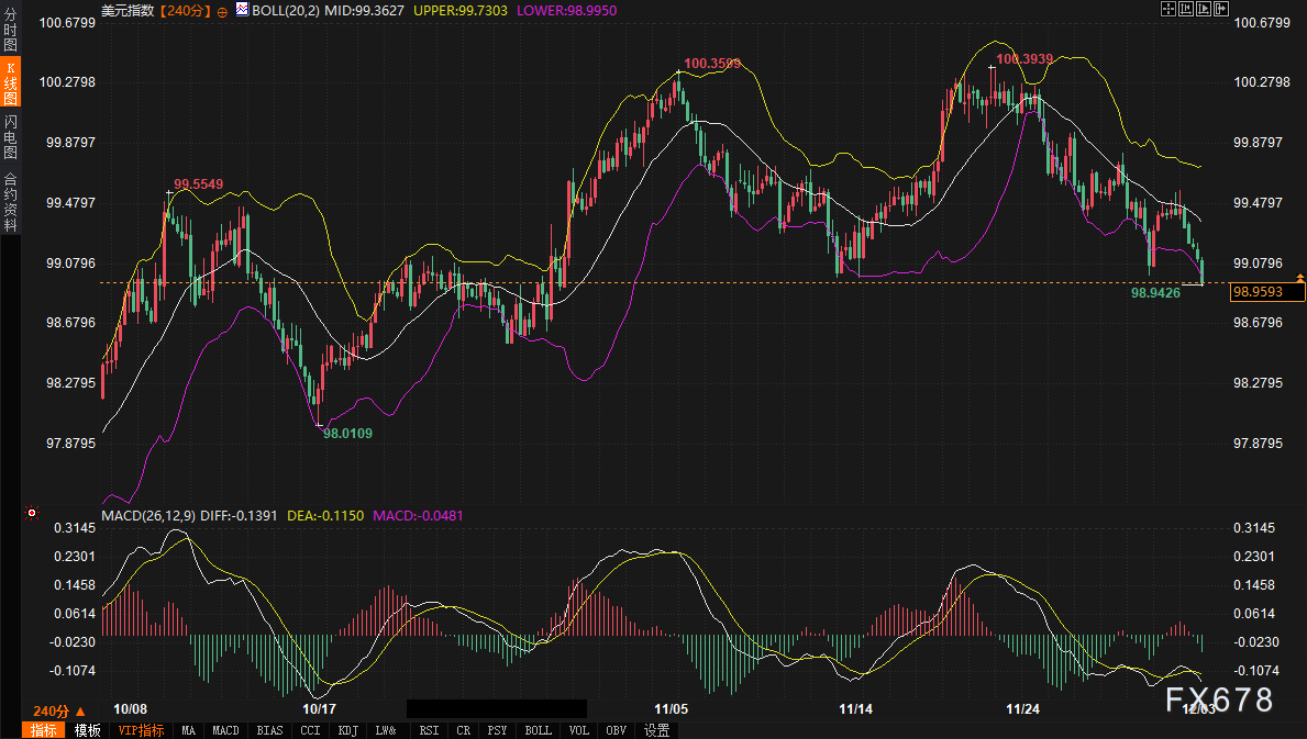 美元指数的即时走势与美债收益率呈现出高度的同步性。其240分钟图显示,美元指数目前已显著跌破布林带中轨99.3629,并向下轨98.9952附近靠拢。MACD指标中的DIFF值(-0.1390)低于DEA值(-0.1150),且双双位于零轴下方,空头动能正在累积。短期内,98.9950-99.000区域将成为关键的下方支撑区间,该位置不仅是布林带下轨所在,也具备重要的心理关口意义。若被有效跌破,可能打开进一步下探的空间。