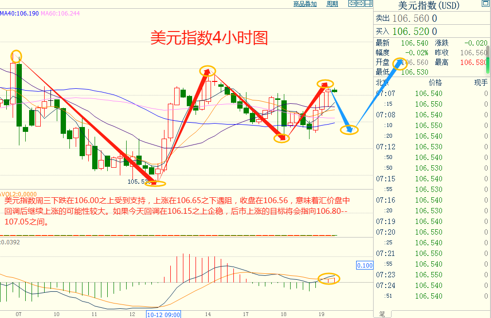 美指周三上涨在106.65之下遇阻,下跌在106.00之上受到支持,意味着美元短线下跌后有可能保持上涨的走势。如果美指今天下跌在106.15之上企稳,后市上涨的目标将会指向106.80--107.05之间。今天美指短线阻力在106.75--106.80,短线重要阻力在107.00--107.05。今天美指短线支持在106.15--106.20,短线重要支持在105.75--105.80。