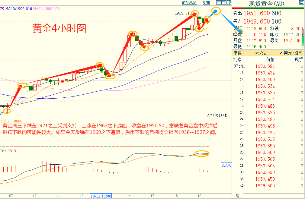黄金周三下跌在1921.00之上受到支持,上涨在1963.00之下遇阻,意味着黄金短线上涨后有可能保持下跌的走势。如果黄金今天上涨在1969.00之下遇阻,后市下跌的目标将会指向1938.00--1927.00之间。今天黄金短线阻力在1968.00--1969.00,短线重要阻力1985.00--1986.00。今天黄金短线支持在1938.00--1939.00,短线重要支持在1927.00--1928.00。
