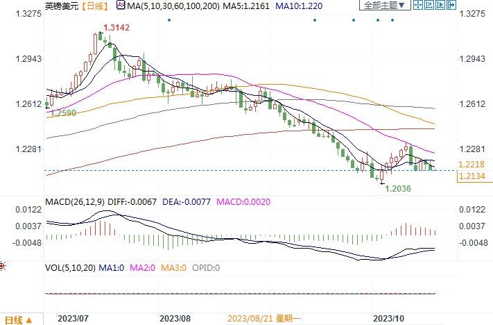 周三(10月18日),英镑兑美元尾盘下跌0.32%,报1.2144。英国9月消费者物价通胀(CPI)意外保持在6.7%的水平,仍是所有主要发达经济体中最高的,受此影响,英镑一度上扬,但之后由升转跌。尽管英国通胀率略高于预期,但这份通胀报告中可能没有任何内容会促使英国央行在11月再次加息。根据国际货币基金组织(IMF)上周的预测,英国是七国集团(G7)发达经济体中通胀率最高的国家,但明年的经济增长速度预计也将是最慢的。而与之相对照的是,当日市场上美债收益率又创历史新高,这继续使美元保持着强势风头。技术图形上,无论小时还是日线图上,汇价都落于布林带中轨线之下,下行倾向仍较明显。下方须密切留意1.2100的支撑,若下穿,下方将会再度考验1.20大关的支撑。上方未有突破近期的震荡区域的强阻力1.23,或才有望看到扭转颓势的希望。