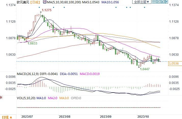 周三(10月18日),美元继续逞强,因指标10年期美债收益率创下16年新高去达4.91%,与同期欧元区债券收益率差进一步扩大,导致欧元兑美元下跌0.38%,报1.0536。消息面上,周三美联储众多官员就有关美元利率问题发表观点,其中美联储理事沃勒周三表示,他希望“等待、观察和观望”美国经济是继续保持强劲势头,还是在联储迄今为止的加息行动后展现疲态。此番发言是一个有力的信号,暗示美联储将不会在下次会议上加息,但很可能在未来加息。纽约联邦储备银行总裁威廉姆斯周三表示,利率需要在一段时间内保持高位,才能使通胀率回到联储设定的2%的目标。而美联储主席鲍威尔和几位地区联储总裁也将于周四发表评论。如果美联储官员们一致在加息还是停止加息事项上保持不松口的倾向,美元料将继续得到支撑而表现强硬。技术图形上,日线图几乎没有显示出走势偏向, 周线图主要趋势则仍然偏向下行,信号指向下跌,10月交投区间1.0448-1.0640两端分别是初步支撑位和阻力位。