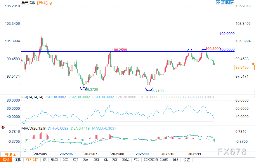 周四(12月4日)欧盘时段,美元指数在亚盘早盘冲高至99.3上方的动能骤然退潮,午后快速回落并在低位震荡,RSI指标同步走弱,分时图上呈现“冲高遇阻、短期承压”的态势。