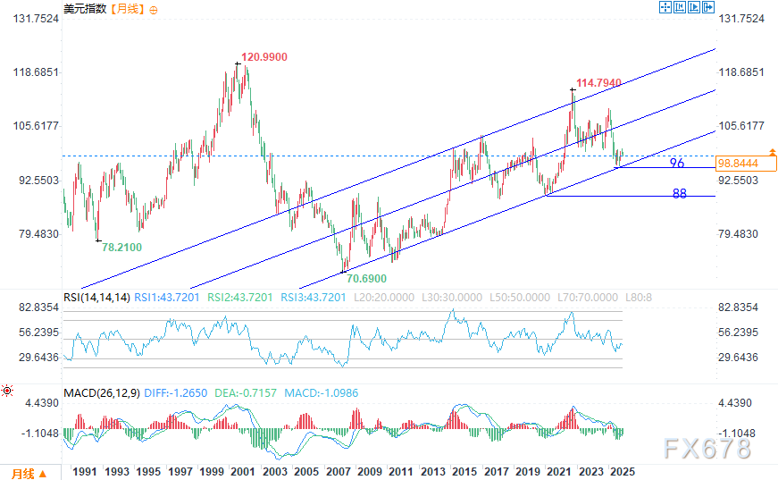 月线图上,得益于2008年低点以来形成的上行平行通道提供支撑,除非指数明确回落至96关口下方,否则长期看涨基调将保持不变。