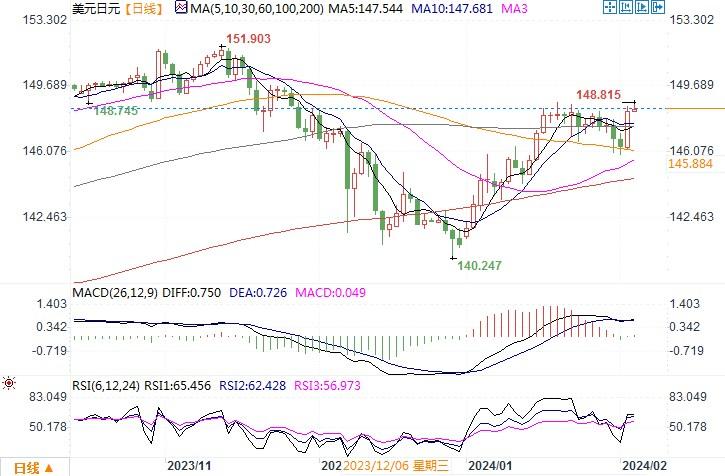 上周五(2月2日),美元指数周五跳涨至七周高位104.04,美元兑日元升至148.58,略低于1月19日触及的11月28日以来最高148.80。上周五美国公布的1月非农就业岗位猛增加35.3万个,超过经济学家预期的增加18万个。平均时薪在12月上涨0.4%后又上涨了0.6%。数据远超预期,市场进一步降低了对3月降息可能性的预期,并削减了对美联储今年累计降息幅度的预期。根据芝商所的FedWatch工具,交易商目前预计3月降息的可能性为21%,低于周四的38%;5月降息的可能性为75%,低于周四的94%。 美元夏季前降息预期的下降,暂时令美元的强势得以维持。美国就业数据的强劲增长盖住了日本央行有望升息的市场注意力,日元近期回升的幅度几乎一夜之间被吞没殆尽。美债收益率的回升,继续对日元构成压制。日线图上,一根大阳柱将一周前的美元跌势尽数修复,美元/日元重回布林带中轨线之上,目前正测试此前的上方前阻力水平149.00,若穿破,则进一步会测试150整数关口。若继续遇阻不过,恐会形成双顶形态。