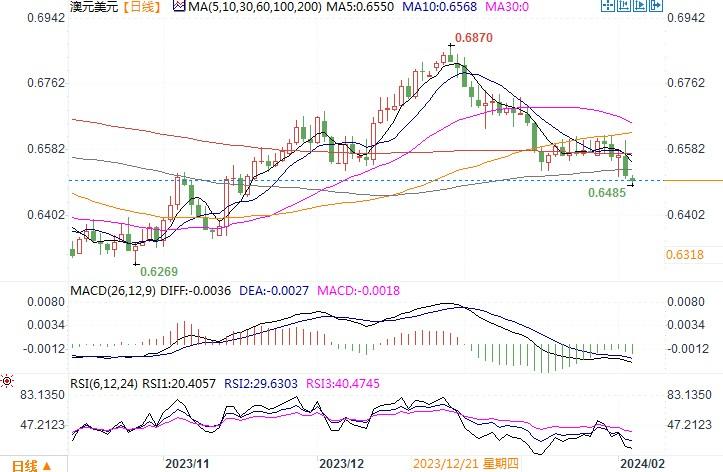 上周五(2月2日),受周五美国强劲增长的非农就业数据影响,澳元/美元跌至10周低点0.65035美元。澳洲国内近期一系列表现欠佳的经济数据,提升了市场对于澳联储将会提早进入降息的预期。澳洲央行将于2月6日召开今年的首次政策会议,鉴于通胀意外下行,该央行被认为肯定会将利率维持在4.35%不变。市场预期其5月份降息的几率约为65%。美国经济表现明显占优的情势下,对美元的支撑作用明显。为此,澳元回升之徒变得艰难,甚至面临着进一步向低位下滑的局面。日线图上,上周五一根大阴柱体打破了此前横盘区间底沿,澳元/美元汇价开始远离布林带通道中轨线朝向下行。技术指标再度面临下摆的趋向,显示澳元仍未能摆脱弱势下行的局面。若下方强支撑0.65破位,下一步可能会测试0.6170-0.6296区域的支撑。