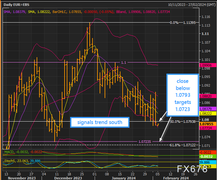 欧元主要支撑位1.0793已跌破,此处为10月/12月涨势的50%回档位,收盘价跌破1.0790后,下行目标将测试12月低点1.0723
