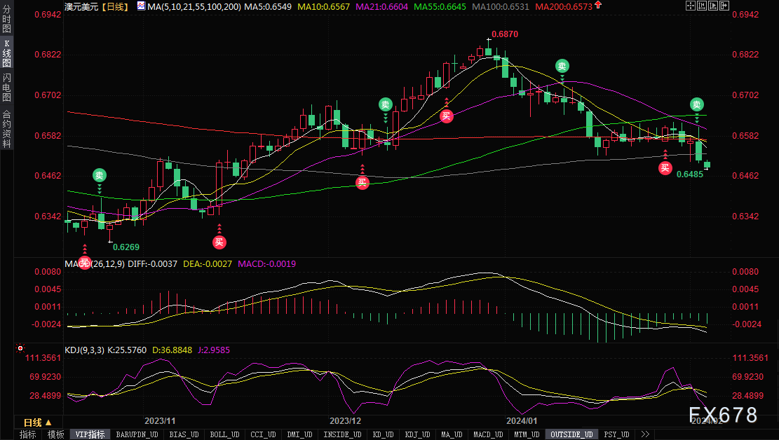澳元兑美元周一亚市也延续跌势,一度刷新11月20日以来低点至0.6485,跌幅约0.43%,上周五澳元收跌0.88%,投资者还关注周二将公布的澳洲联储利率决议。