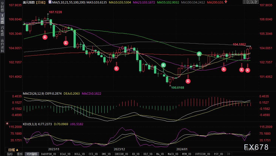 上周五,美元指数大涨0.86%,录得近一个月最大单日涨势,因为美国1月份非农就业报告表现非常强劲,进一步打压美联储3月份降息预期。