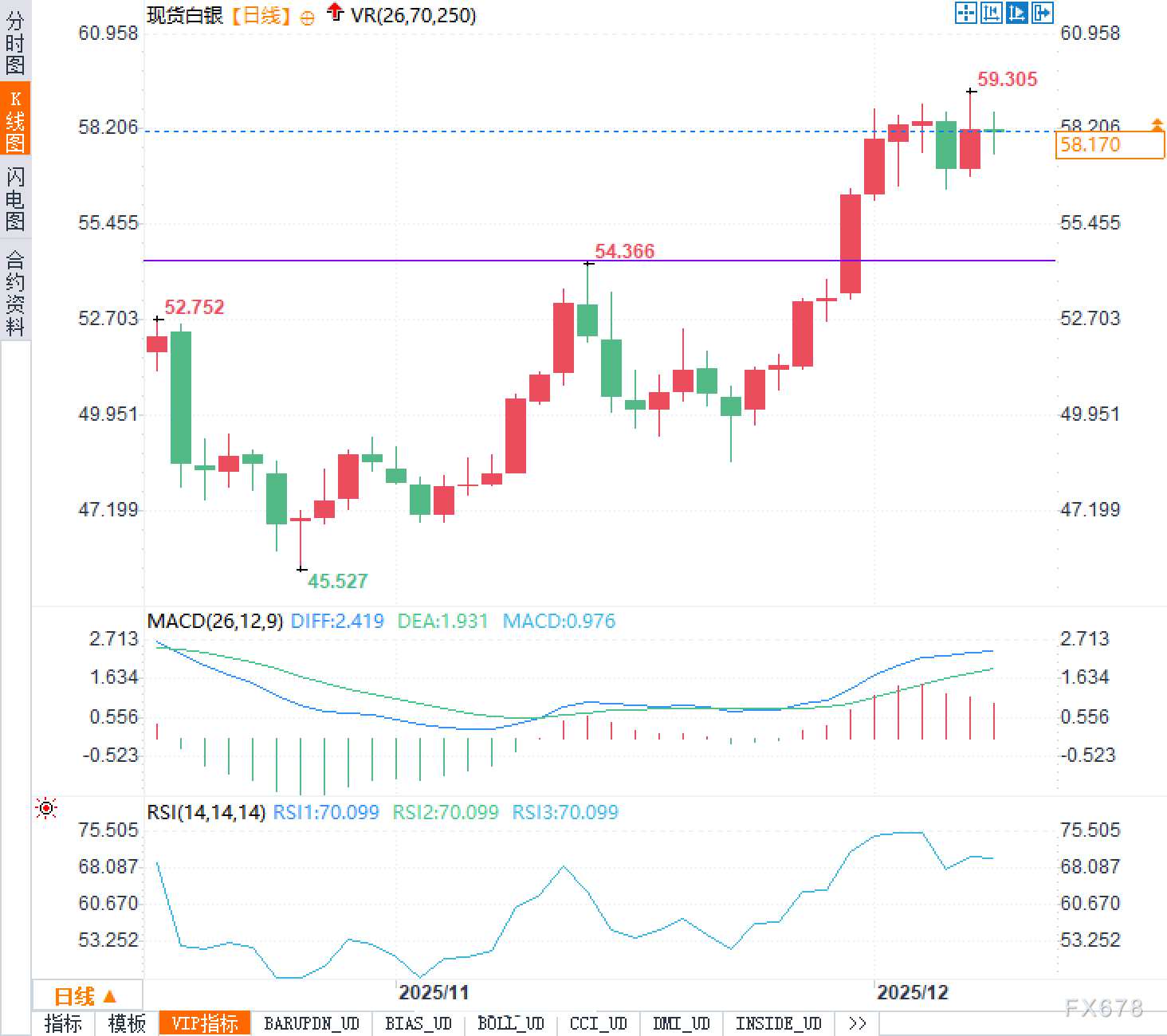 从日线图看,现货白银自45.527一带低点以来形成震荡上行结构,近期突破前期密集区后呈现加速段,价格一度触及59.305附近。随后高位收敛,最新交投58.20美元附近。K线实体与上影交错,显示多空在58—59区间反复试探。MACD双线在零轴上方扩散,柱体维持正值,反映中期动能仍占优;但RSI约70,进入相对高位区,短线情绪可能偏热,强势中也更易出现洗筹式震荡。上方观察59.3及60关口附近的压力演变;下方则关注55.5及52.7一带的支撑稳定性。整体趋势偏强的格局未被破坏,但高位换手与消息敏感度上升,意味着节奏可能从“快攻”转向“消化”。