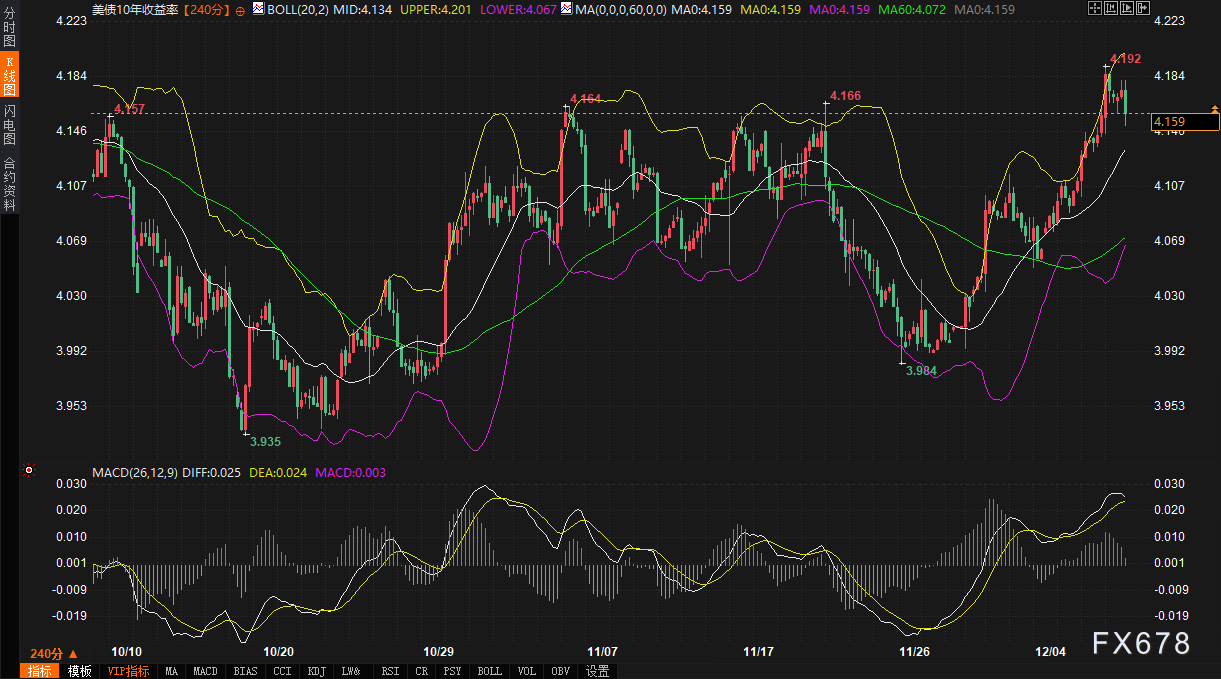 周二(12月9日),金融市场在美联储年末政策会议前夕表现敏感。美元指数日内微跌0.04%,报99.0719,继续横向整理,显示投资者在政策明朗前保持谨慎。10年期美债收益率报4.159%,日内小幅走低0.29%,但近两周累计上升近17个基点,表明市场正在消化美联储可能释放的信号。现货黄金上涨0.34%,报4204.52,在债市波动中呈现避险买盘。早盘美债成交温和,10年期合约成交28.5万手,曲线因欧洲债市反弹而趋平。欧美股市表现平淡,凸显当前债市动向对汇率与贵金属市场的传导效应。