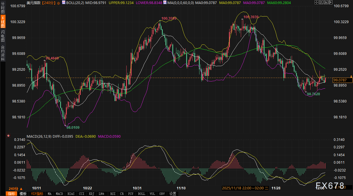 美债市场的表现直接影响美元短期走势。10年期美债收益率虽日内略降,但其技术指标显示价格运行于布林带中轨上方,且MACD指标接近金叉,暗示短期跌势可能趋缓。这与早盘欧洲债券反弹带来的平仓压力有关,曲线呈现平坦化倾向。当前市场交投谨慎,观望情绪浓厚。