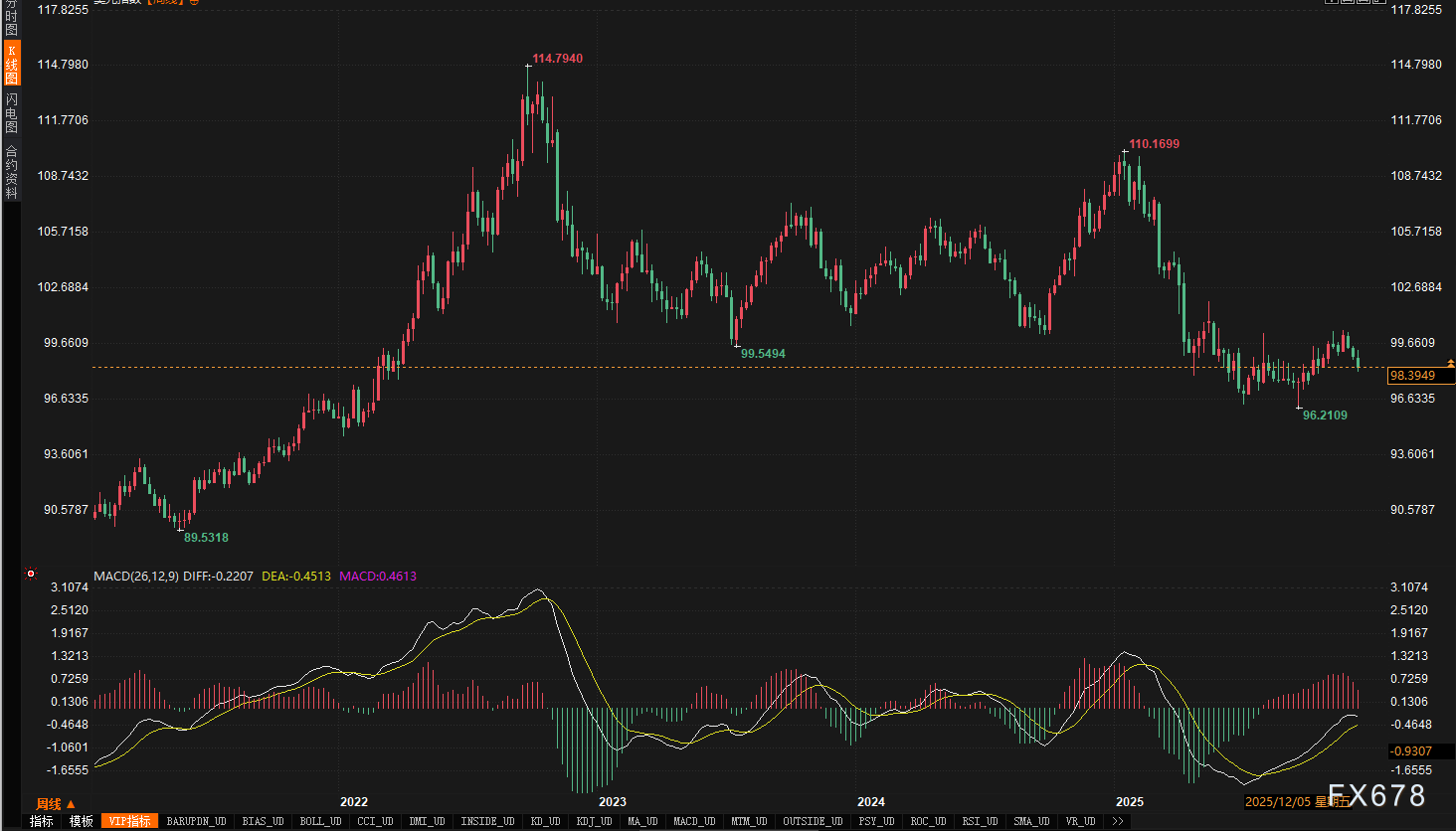 本周美元指数延续疲软态势,呈现震荡下行格局。前半周在美联储利率决议前,市场情绪谨慎,美元承压。周三美联储如期降息后,因主席鲍威尔的表态及政策声明被市场解读为不及预期鹰派,美元抛售压力加剧,指数于周四跌至两个月低点。尽管周五录得小幅技术性反弹,收报98.44,但全周仍下跌0.6%,为连续第三周收低。年初至今,美元指数跌幅已超过9%,有望创下自2017年以来的最大年度跌幅。