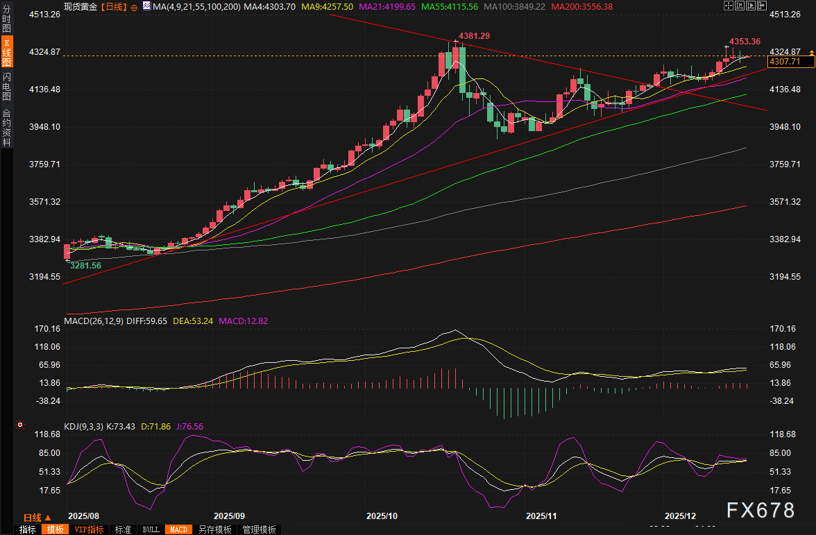 周二(12月16日),现货黄金价格在高位震荡,盘中一度跌至4272美元附近,却又迅速反弹至4335美元,最终收报4302美元,基本持平。这种波动并非偶然,而是受到了美国就业数据、地缘政治紧张局势以及美联储政策预期的多重影响。数据显示,美国11月就业岗位增长反弹,但失业率意外升至4.6%的四年高位,这不仅强化了市场对美联储进一步降息的预期,还推动美元指数触及两个月低点,令黄金对海外买家更具吸引力。同时,俄乌冲突的最新进展为黄金提供了潜在的避险支撑。投资者们正密切关注即将公布的CPI和PCE数据,以及美联储官员的讲话,这些因素将共同塑造黄金的短期走势。周三(12月17日)亚市早盘,现货黄金窄幅震荡,目前交投于4306美元/盎司附近。