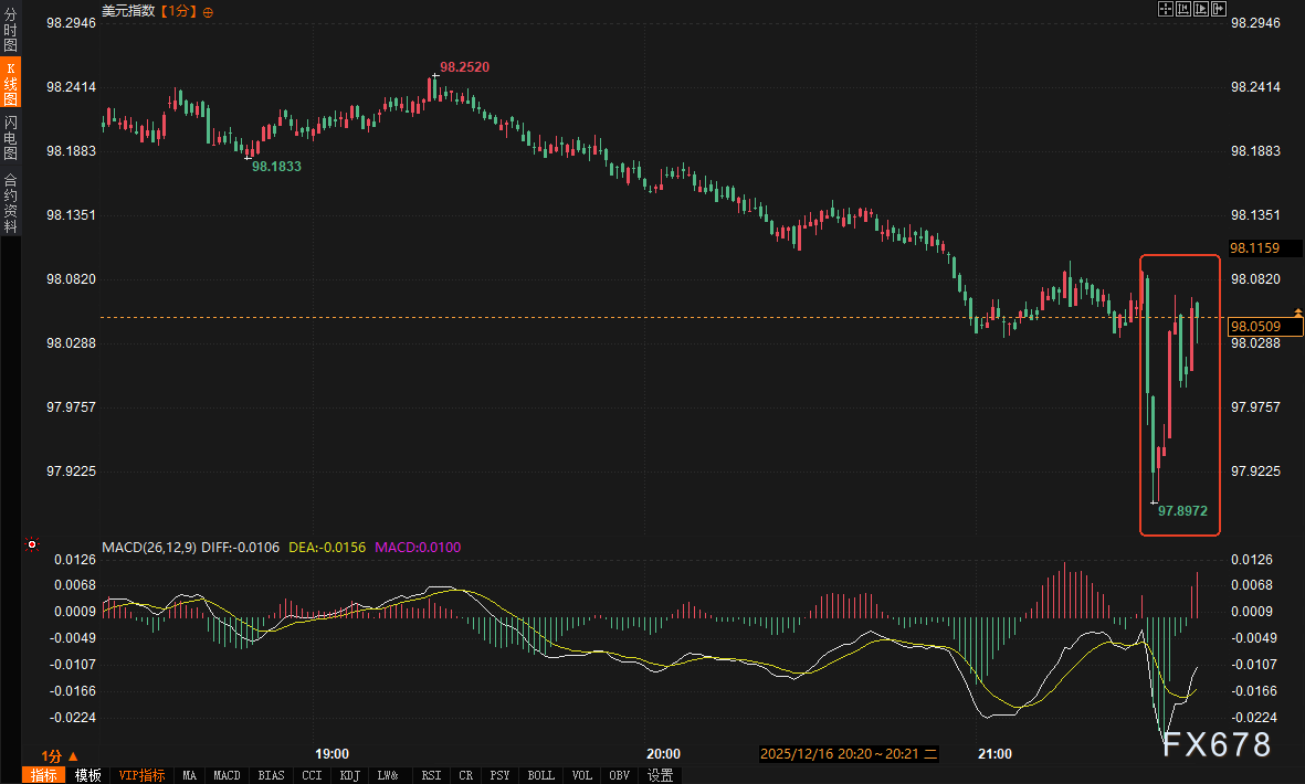 数据公布后,金融市场反应迅速且出现分化。现货黄金自数据公布前的4301美元/盎司附近快速拉升逾10美元,最高触及4312美元,随后持稳于4308美元一线;COMEX黄金期货主力合约同步走高至4339美元附近。美元指数则加速下行,从98.05附近跌至97.90下方。美国国债收益率普遍回落,10年期收益率下跌约2.7个基点至4.157%。利率期货市场显示,交易员对美联储明年1月降息的预期概率小幅上升,但对2026年整体的降息幅度预期仍维持在约两次、58个基点左右。