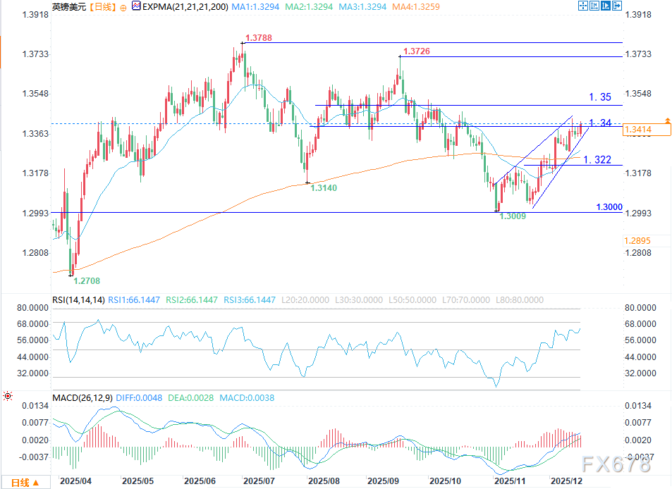 周二(12月16日)当前英镑/美元分时图呈现快速冲高走势,价格突破前期震荡区间,短期多头动能较强。盘中报1.3418/19,涨幅0.34%。