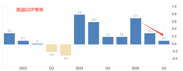 上图是英国季度GDP增速环比数据。2023年三季度和四季度,英国季度GDP连续下降。2024年至今的两年时间,GDP环比增速一直处于1%以下,最低达到今年三季度的0.1%。2024年一季度和2025年一季度的环比增速有所反弹,但随之而来的是连续多个季度的下降。GDP数据是宏观经济表现的最重要参考指标,环比增速的下降正在逼迫英国央行采取更加宽松的货币政策。