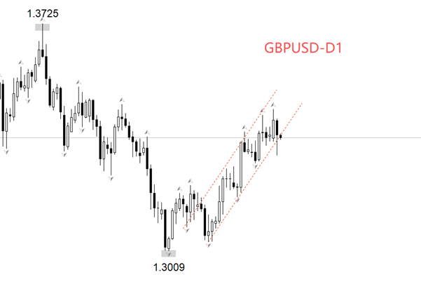 行情方面,日线级别,GBPUSD处于中期震荡状态,震荡的起始日期约为5月12日。在这一轮持续超半年时间的震荡过程中,GBPUSD最高触及1.3787点,最低触及1.3009点,区间778点,属于宽幅震荡。如上图所示,1.3725是中期高点,1.3009是中期低点,1.3009之后的上涨行情,是在寻找新的中期高点。考虑到中期走势为震荡,所以前一个中期高点1.3725有可能成为当前上涨波段的阻力位。另外,最新上涨波段运行于图中上升通道内部,一旦有连续的K线跌破通道下轨,意味着中期高点形成。中期高点形成后,新的下跌波段随之出现。