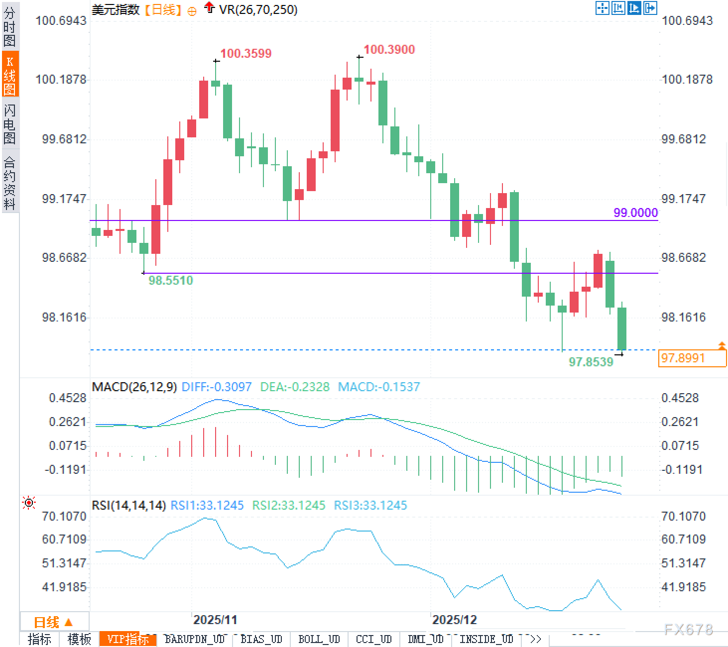 12月23日,星期二。外汇市场正处于年末交投清淡的特殊时段,冬季假期临近导致市场流动性明显收缩。在此背景下,美元指数近期呈现出显著的回调态势,从阶段性高点100.39附近持续走低,当前欧洲时段已跌至97.90一线附近,累计跌幅超过2%。