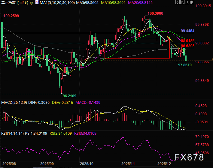 周二(12月23日)欧洲早盘交易时段,衡量美元兑六大主流货币表现的美元指数(DXY)延续弱势节奏,盘中一度触及97.91附近的月度低点,这一走势充分反映出,市场对美联储在近期降息后延续宽松周期的押注正在不断升温。