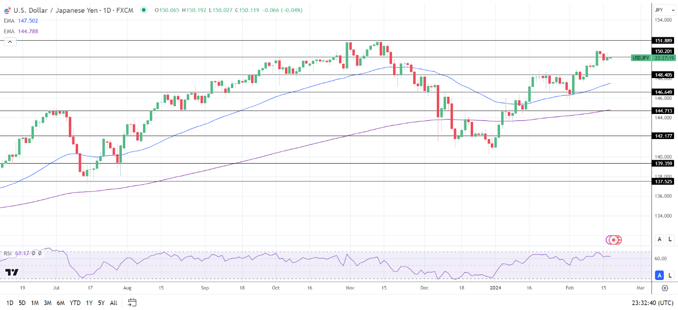 14天RSI为63.17,表明美元/日元在进入超买区域之前将升至151关口。