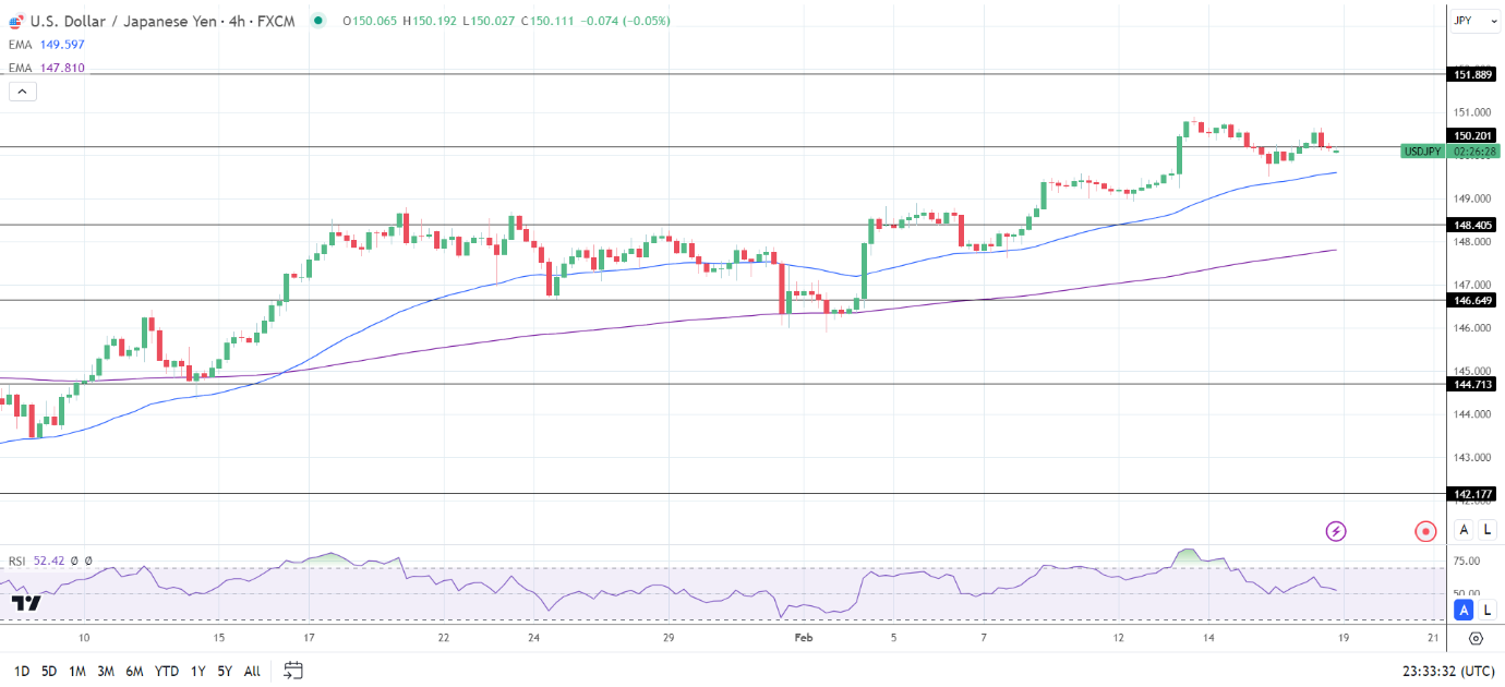 14周期4小时RSI为52.42,表明美元/日元在进入超买区域之前将回到151关口。