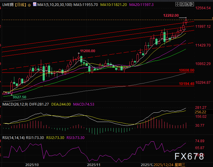 周三(12月24日)亚欧时段铜价强势刷新历史纪录,伦敦金属交易所铜现货报价一举站稳12000美元,盘中更是快速拉升超过1%触及12282美元的高位,2025年以来累计涨幅飙升接近40%,创下2009年以来的最大年度涨幅。