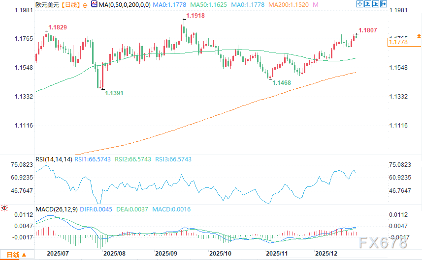 200日均线(1.14965)自2025年3月以来持续提供坚实支撑,近期汇率向上突破50日均线(1.16088),进一步确认上升趋势。这意味着,欧元/美元将以强势姿态开启2026年,有望挑战年内高点1.19188。