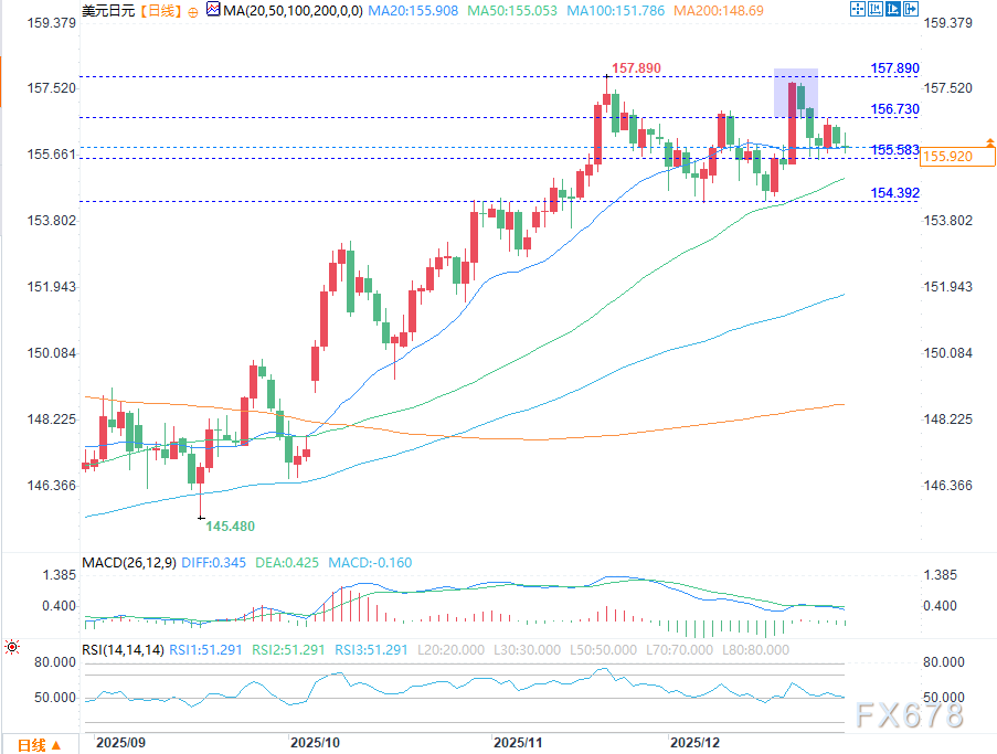 上周,美元/日元汇率自157.70一线反弹后大幅下挫。技术面分析显示,该货币对日线图形成看跌孕线形态,后续存在进一步下行空间。不过在流动性萎缩的市场环境中,汇率在155.60附近获得短期支撑,若从此位置反弹,有望触发一轮指向156.70的修正行情。