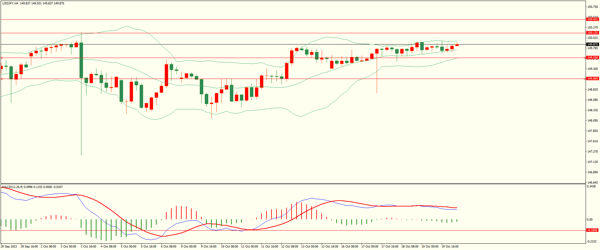 美日昨日表现较为震荡,日线报收上下影线小阴线,总体来看,日线依然处于高位震荡格局,短线进退两难,从4H来看,布林中轨偏上,MACD零轴上方运行,日内上方阻力150.10,第二阻力150.45,下方支撑149.50,149.00,保持在第一阻力下方短线有望测试第一支撑。